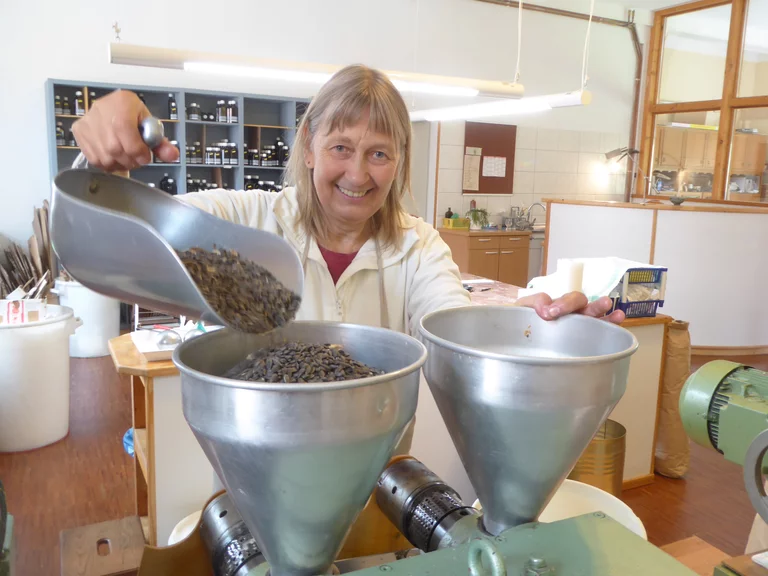 gelangt unser Öl in die dunklen Glasflaschen und zu Ihnen.